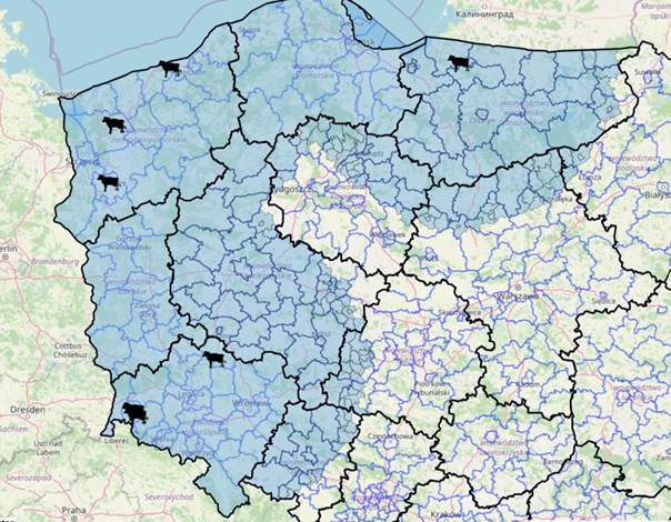 2025-01-09 w woj. warmińsko-mazurskim w pow. Lidzbark Warmiński, gm. Orneta, w miejscowości Nowy Dwór(l. szt. w ognisku – 76, l. szt. z pozytywnym wynikiem – 1)2025-01-09 w woj. zachodniopomorskim w pow. Goleniów, gm. Osina, w miejscowości Osina(l. szt. w ognisku – 28, l. szt. z pozytywnym wynikiem – 1)2025-01-23 w woj. zachodniopomorskim w pow. Goleniów, gm. Osina, w miejscowości Osina (l. szt. w ognisku – 42, l. szt. z pozytywnym wynikiem – 3).